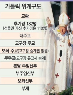 추기경은 주교 중에서 선출된다. 1586년 70명에서 차차 증원돼 현재 182명이며 이 가운데 교황 선출권을 가진 추기경은 110명이다.
