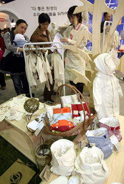 ![]() 출산의류 브랜드인 오가닉트리는 유기농 면으로 만든 배냇저고리 등 영유아용 의류를 선보였다. 박영대 기자 |