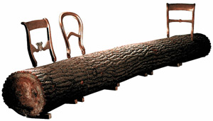 서랍들을 차곡차곡 쌓아 만든 옷장, 재활용 천 조각을 엮어 만든 의자, 긴 통나무를 눕힌 뒤 금속 의자 등받이 세 개를 군데군데 박아 만든 벤치….