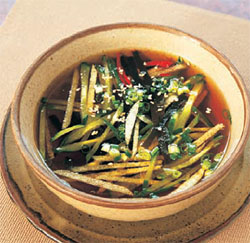 ▽재료=다시마 100g, 실파 10g, 홍고추 2개, 오이 1개, 배 1/4개, 간장 2 큰술, 설탕 2 큰술, 식초 6 큰술, 물 6 큰술, 소금 통깨 약간