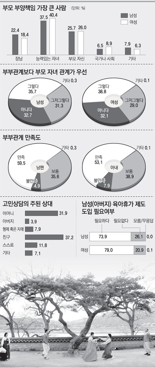 남녀 모두 자녀를 배우자보다 더 중요한 가족구성원으로 생각하고 있으며 부모자식관계(37.4%)가 부부관계(32.4%)보다 중요하다고 인식하고 있었다.