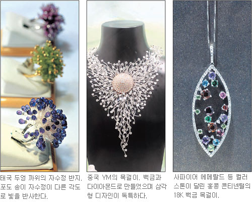 전시의 특징은 컬러 스톤을 활용한 심플 아이템과 예술적 아이디어가 돋보이는 디자이너 작품. 화려한 원색을 살리면서도 절제미를 가미한 제품이 많았다. 제이 에스티나 김기석 부사장은 “올해에는 몇년동안 지속되어 온 장식적인 트렌드에서 미니멀리즘을 향해가는 과도기의 해로 클린한 이미지가 주류로 등장할 것”이라고 내다봤다.