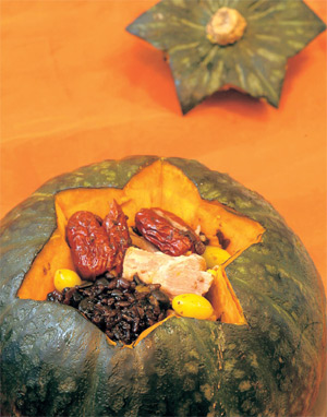 ▽재료=단호박 1개, 돼지고기 300g, 둥굴레 20g, 은행 10개, 꿀 3작은술, 검은콩 1/2컵, 흑미 1/2컵, 대추 5개, 간장 1큰술, 꿀 2큰술, 후춧가루 2작은술
