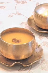 ▽재료=단호박 1개, 황기 10g, 감초 3개, 산약(마를 말린 것) 20g, 물 1L, 밀가루 3큰술, 버터 5g, 소금 1/2큰술, 생크림 1큰술