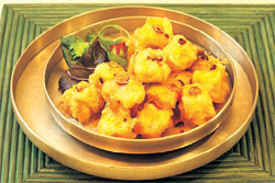 ▽재료=늙은 호박 200g, 튀김가루 1컵, 식용유 4컵, 감자전분 2큰술 , 유자청 2큰술, 물 1컵, 참기름 1/2큰술, 소금 1작은술