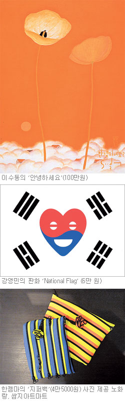 노화랑에서 종로2가 쪽으로 조금 떨어진 곳에 쌈지길이란 건물이 있다. 이 건물 지하에 갤러리 쌈지(www.ssamziegil.com)가 운영하는 상설매장 ‘쌈지아트마트’가 문을 열었다. 복도부터 좁은 마트 매장 안까지 회화, 드로잉, 판화, 오브제 등 실험적이고 재기발랄한 작품들이 가격표와 함께 걸려 있다. 윤석남 백순실 이불 씨의 판화작품이 15만 원, 권재홍 씨의 미니어처 모델 ‘태권 V’는 35만 원. ‘고맙습니다’라는 글씨가 담긴 이진경 씨의 소품은 18만 원이다.