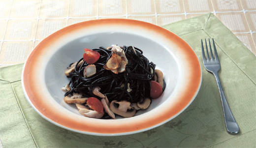▽재료=간고등어 1마리, 오징어 먹물 스파게티 면 100g, 마늘 5개, 올리브 오일 약간, 체리 토마토 5개, 양송이버섯 5개, 잣 약간, 올리브 오일, 소금 약간, 후추 약간