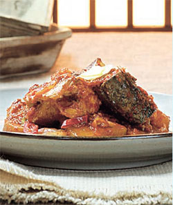 ▽재료=간고등어 1마리, 무 1/3개, 감자 1개, 양파 1/4개, 대파 1대, 청·홍고추 1개씩, 간장 3큰술, 맛술 3큰술, 물 3큰술, 설탕 1/2 큰술, 다진 마늘 2큰술, 고춧가루 1큰술, 생강즙 약간