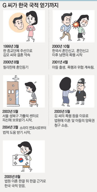 G 씨는 지난해 8월 법원에서 아들의 양육권과 함께 이혼 판결을 얻어 낸 뒤 가톨릭센터 신부의 신원보증으로 한국 국적을 얻을 수 있었다. 결혼해서도 가질 수 없었던 한국 국적을 이혼한 뒤에야 얻게 된 것.