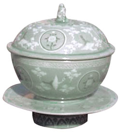 ‘청자상감용봉모란문 개합’(국보 제220호)의 모란 모양 대신 국화 모양을 넣어 재현한 이 청자는 뚜껑과 받침, 그릇 등 세 부분이 한 세트로 시가 35만 원.