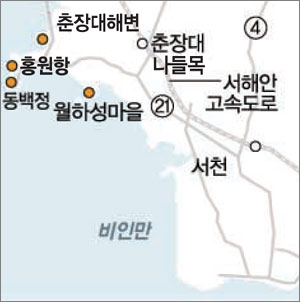 ◇찾아가기 △서해안고속도로=춘장대 나들목∼21번 국도∼607번 지방도∼동백정(마량포구). 서울 광화문∼경부고속도로∼평택안성 고속도로∼서해안고속도로∼춘장대 나들목 204km, 나들목∼마량포구 동백정 12km. ◇서천 동백꽃 주꾸미축제=4월 7일까지. 마량리 동백정 앞(700대 수용 주차장). △인라인스케이트장(무료): 주차장. △맛조개잡이 체험(3000원): 월하성 해변. 맛소금(한 봉지 1000원)을 뿌려 삽(대여 1000원)으로 잡는데 한바구니(2kg)만. 문의 041-952-7060, 최병혁 어촌계장(011-436-4391). ◇축제문의 △서면개발위원회(seomyun.ivyro.net): 041-952-9123 △서면사무소(www.seomyeon.go.kr): 041-951-8104