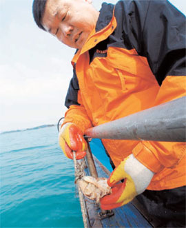 이런 채취방식을 ‘소라방’이라고 부른다. 고둥껍데기는 1m 간격으로 매다는데 그 수가 보통 5000개, 많으면 1만 개. 그러니 로프 길이만 5km, 10km다. 이삼일에 한 번 건지는데 평균 다섯 개에 하나 꼴로 주꾸미가 들어 있다. 주꾸미가 고둥껍데기에 드는 것은 알을 낳기 위해서다. 이즈음 잡히는 주꾸미는 알배기다.