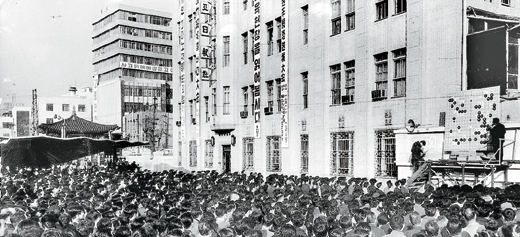 ![]() 1968년 동아일보 초청으로 김인 국수와 일본의 린하이펑 9단이 한국에서 특별대국을 벌였을 때 공개 해설이 진행된 동아일보 사옥 앞에 바둑팬들이 구름처럼 몰려들었다. 동아일보 자료 사진