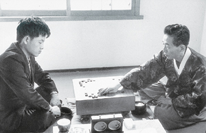 ![]() 조남철 8단(오른쪽)은 1966년 10기 국수전에서 젊은 도전자 김인 5단의 도전에 힘없이 무너져 10회 연속 우승에 실패했다. |