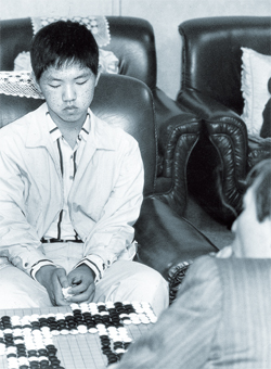 ![]() 1990년 10월 10일 15세 국수가 등장했다. 이창호 9단은 34기에서 조훈현 9단을 물리친 뒤 무안한 듯 고개를 들지 못하고 있다. 얼굴에 여드름 자국이 선명하다. |