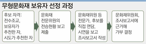 ▽선정 이후의 관리 소홀=현재 무형문화재 보유자는 111개 종목, 200명에 이른다. 그러나 지금까지 보유자로 선정된 뒤 사망 이외의 사유로 해제된 사람은 형사사건으로 구속된 1명에 불과하다. 문화재 관계자들 사이에선 일부 보유자의 기량이 현격하게 떨어진다는 것이 공공연한 비밀이지만 선정된 이후에 이들을 관리할 장치는 전혀 없다.