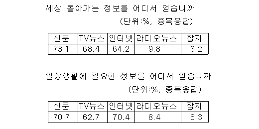 '일상생활에 필요한 정보를 어디서 얻느냐'는 질문에도 '신문'을 꼽은 독자의 비율이 70.7%로 가장 높았고 인터넷(70.4%) TV뉴스(62.7%) 라디오뉴스(8.4%) 잡지(6.3%) 순으로 나타났다.