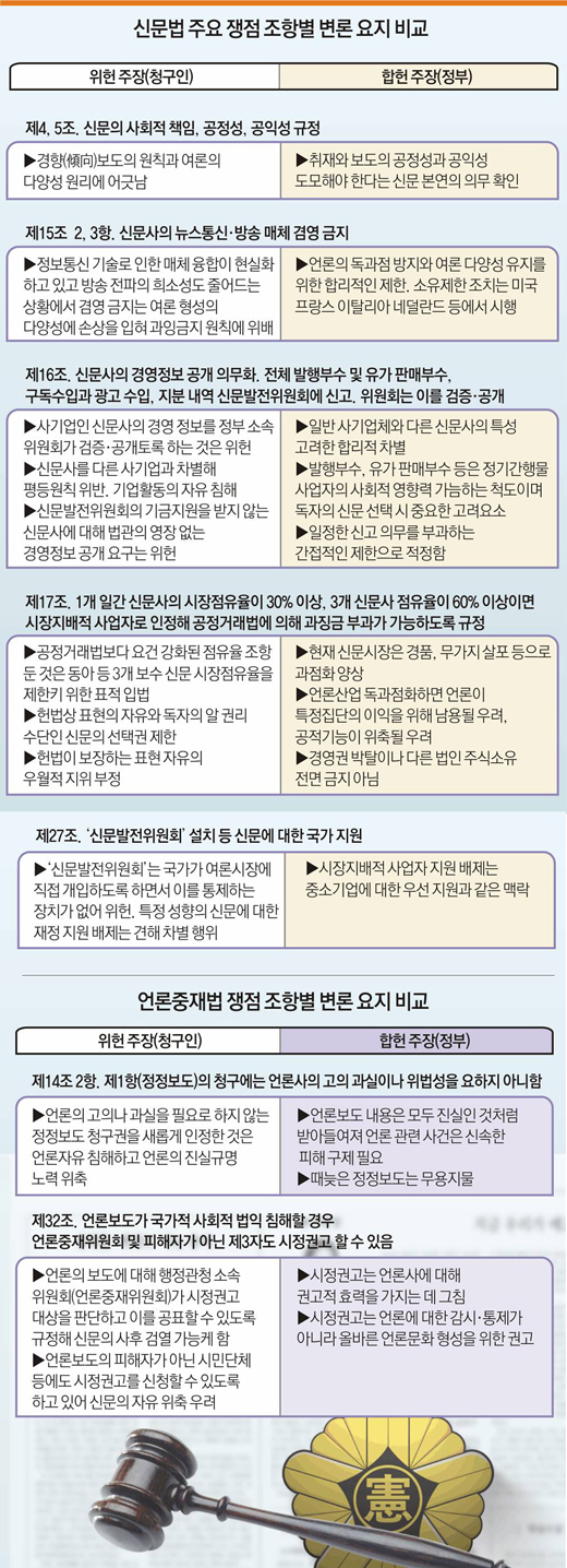 이 변호사는 신문법 조항 중 신문사의 전체 발행부수 및 유가 판매부수, 구독 수입과 광고 수입, 주식 지분 명세를 신문발전위원회에 신고하도록 규정한 16조가 위헌이라고 지적했다.