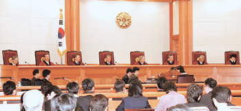 윤영철(尹永哲) 헌법재판소장 등 재판관 9명 전원이 지켜보는 가운데 동아일보와 조선일보 등의 대리인 7명은 문화관광부와 언론중재위원회 등 정부 대리인 6명과 뜨거운 공방을 벌였다. 100여 명의 방청객은 양측의 주장에 귀를 기울였다.
