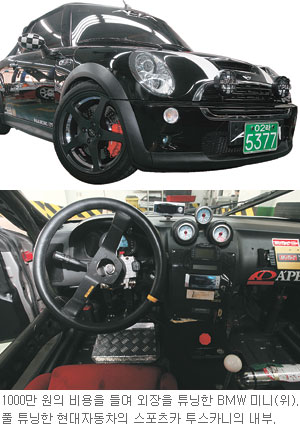 요즘 인기 있는 튜닝 차는 BMW 미니. 젊은 감각에 맞으면서 화려하고 아기자기한 ‘드레스업(외장 튜닝)’이 잘 어울려 ‘미니=튜닝’이란 등식이 서울 강남 일대를 중심으로 확산되고 있다.