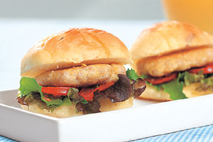 ▽재료=콩비지 50g, 다진 양파3큰술, 다진 당근 2큰술, 다진 쪽파 1큰술, 달걀 1개, 다진 마늘 약간, 녹말가루약간, 밀가루 약간, 소금, 후추, 모닝빵 3개, 양상추 2잎, 토마토 4분의 1개, 오이 6분의 1개, 버터, 허니 머스터드 소스