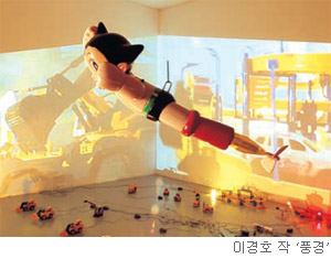 5월 28일까지 서울 종로구 평창동 갤러리 세줄에서 열리는 ‘이경호 개인전-Traveler’에 선보인 ‘풍경’이란 비디오설치 작품이다. 현대미술이 난해하다고 하지만 이 전시회는 작가의 잔잔한 유머로 보는 이들에게 쏠쏠한 재미와 웃음을 안겨 준다. 장난감 중장비들을 활용한 이 작품은 어른은 물론 아이들에게도 지루하지 않을 법한데 작가는 덤으로 관객들이 발로 찰 수 있도록 스테인리스 그릇까지 갖다 놓았다.