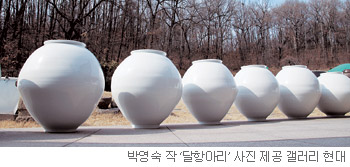 높이 60cm 안팎의 대형 달항아리들은 현대 미감에 맞춰 재창조된 작품들이다. 조선시대 달항아리보다 훨씬 크고, 풍만함보다 준수함에 무게를 실어 날렵함을 더했다.
