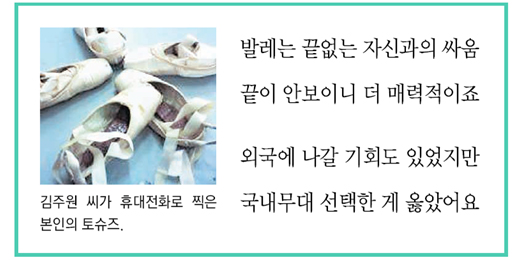 “사실 발레단 월급으로는 여전히 생활이 적자예요. 그래서 부모님한테 죄송하죠. 제가 신는 토슈즈는 한 켤레에 10만 원이지만 발레단에서 토슈즈 구입비용으로 지원해주는 것은 2만5000원입니다. 토슈즈 값만 한 달에 150만 원이 드는데 제 월급은 300만 원이 안 돼요.”