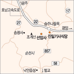 ▽찾아가기 △진일기사식당:호남고속도로 승주 나들목∼22번 국도(구례 방향)∼857번 지방도(순천 방향). 선암사까지 6km △선암사:진일기사식당∼857번 지방도∼죽학 삼거리∼832번 지방도∼괴목(사하촌)∼주차장. www. seonamsa.co.kr 061-754-5247 △식당 이용:오전 7시∼오후 9시 반 영업. 추석 설 연휴에만 쉼. 061-754-5320 ▽길따라 맛따라 패키지 △당일=29, 30일, 5월 1, 6, 7일 출발. 선암사∼진일기사식당∼지리산 할미봉(철쭉 군락). 3만8000원. 승우여행사(www.swtour.co.kr) 02-720-8311