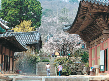 이 어울림을 뒤로 하고 길가 야생 차밭을 지나면 일주문이다. 문 곁 고목의 마른 가지에까지 ‘봄물’이 푸르게 들었다.