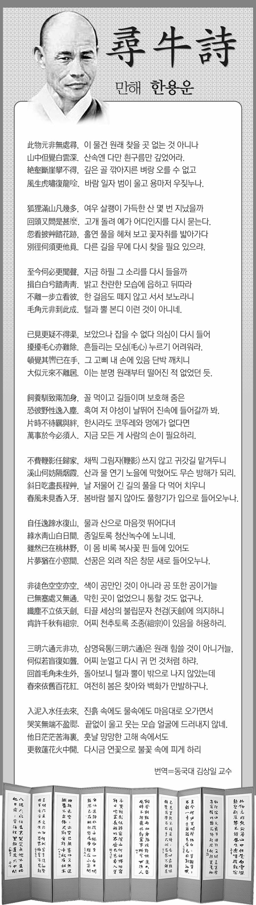 동국대는 3일 만해의 한시(漢詩) ‘심우시(尋牛詩)’가 적힌 10폭짜리 병풍을 공개했다. 만해는 이 학교의 설립 첫해 입학생이다. 이 병풍은 동국대 개교 100주년을 기념해 4∼31일 대학도서관에서 열리는 ‘동국 백년전’ 전시회에서 공개된다.