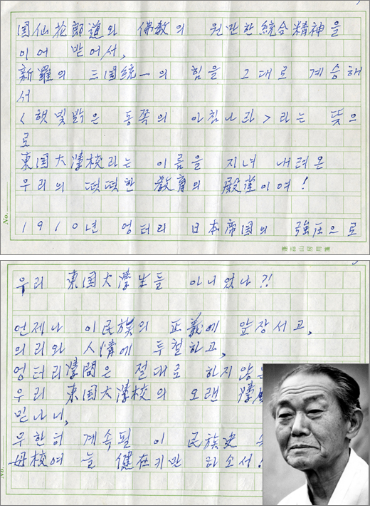 미당 서정주가 남긴 시는 ‘동국대학교 개교 100주년을 앞두고’라는 제목의 축시다. 동국대 출신이며 20년을 동국대 교수로 재직한 미당이 100주년을 10년 앞둔 1996년 3월 기념사업회의 청탁을 받아 쓴 것이다. 미당은 “100주년을 맞아 쓰면 될 텐데 벌써 청탁한다”면서 웃었다고 한다. 당시 국문과 교수로 미당의 자택을 찾아갔던 홍기삼 총장은 “100주년이 되는 날 기념식장에 오셔서 꼭 낭송해 주시길 바란다”고 청했고, 미당은 “문제없다”고 답했다. 미당은 두 달 만에 원고지 5장 분량(6연 32행)의 시를 건네줬고 이 축시는 도서관 귀중본 자료실에 보관됐다가 개교 100주년을 맞아 공개됐다. 원고는 13일까지 교내에 전시됐다가 금고에 보관되고 올가을 타임캡슐에 들어간다.