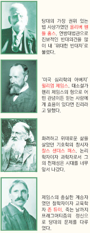 법학자 홈스, 미국 심리학의 아버지 제임스, 화려하고 위태로운 삶을 살았던 기호학의 창시자 퍼스. 그리고 제임스의 충실한 계승자였던 철학자 겸 교육학자 존 듀이.