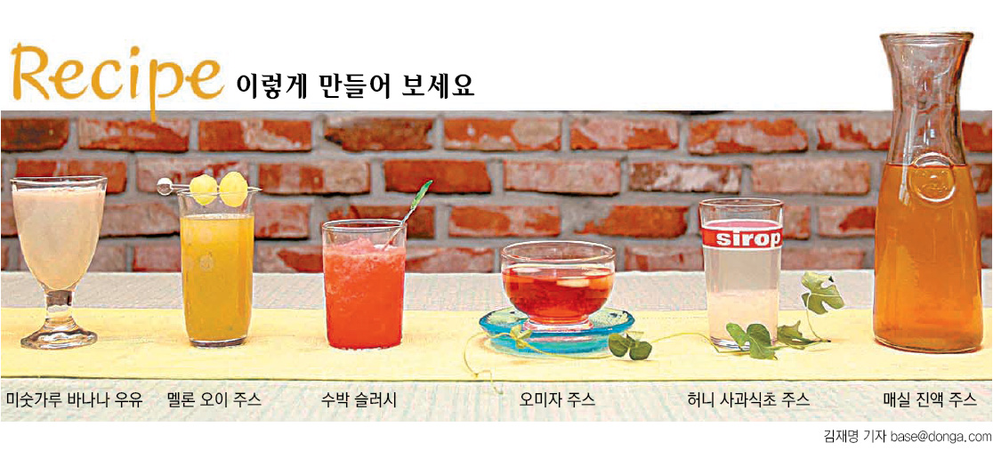 갈증 해소도 돕고 여름철 부족한 영양을 보충할 수 있는 음료를 엄마가 직접 만들어 먹이면 어떨까. 수박, 토마토, 키위, 멜론 등 제철 과일에 물이나 우유, 두유 등을 넣고 곱게 갈면 훌륭한 음료가 된다. 바나나에 찐 고구마나 미숫가루 등을 넣고 우유나 두유를 넣어 갈면 간식은 물론 아침 식사대용식이 될 수도 있다.