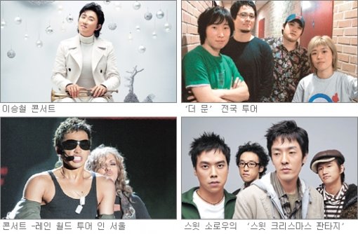 ① 15일 오후 8시, 16일 7시, 17일 7시 ② 서울 중구 순화동 호암아트홀(02-751-9606∼10) ③ 6만6000원 ④ ‘유재하 음악경연대회’ 출신의 4인조 남성 보컬 그룹 ‘스윗 소로우’의 크리스마스 공연. 1집 타이틀곡 ‘스윗 소로우’를 비롯해 ‘아무리 생각해도 난 너를’ 등의 히트곡과 크리스마스 캐럴 공연.