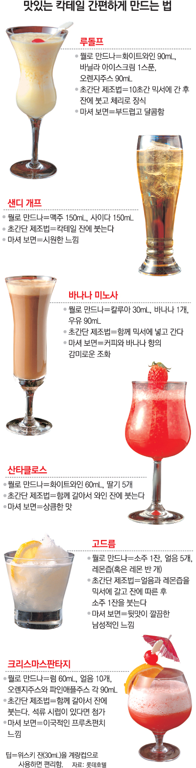 최 바텐더가 추천한 홈파티용 칵테일은 ‘크리스마스 판타지’, ‘산타클로스’, ‘루돌프’, ‘고드름’, ‘바나나 미노사’, ‘샌디 개프’ 등 6가지. ▶그림 참조