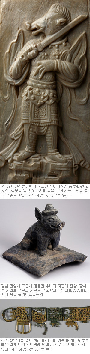 개와 멧돼지가 맞선 통일신라 무덤 발굴 돼지 토우(흙으로 만든 인형)도 흥미롭다. ‘돝’ ‘도야지’로 불렸던 돼지는 양식으로서 가축과 사냥의 대상이었기 때문에 신라인들은 내세의 양식을 위해 돼지 형태의 토우를 만들어 묘지에 함께 묻었다. 낙랑에서는 죽은 자의 손에 옥으로 만든 돼지 ‘옥돈(玉豚)’을 쥐게 했다.