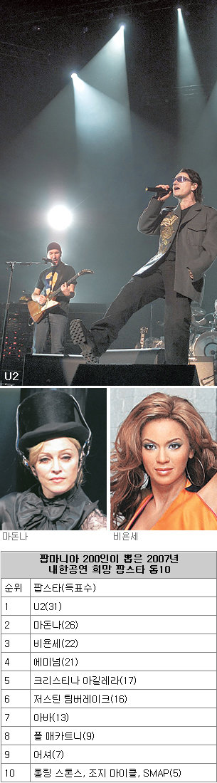 팬들이 가장 기다리는 내한 공연의 주인공은 ‘U2’와 마돈나였다. 지난해 미국에서만 각각 120만 명의 관객을 동원한 스타들답게 이들은 각각 31표, 26표로 1, 2위에 올랐다. 20, 30대 남성들의 지지를 받은 ‘U2’는 “말이 필요 없다” “데뷔 30년이 지나도록 한계를 모르는 이들의 무대가 궁금하다” “이제 DVD는 그만, 직접 보고 싶다” 등의 찬사를 받았다. 모든 세대 여성들에게 고루 표를 얻은 마돈나에 대해서도 팬들은 “섹시아이콘의 대명사인 만큼 볼거리가 다양할 것 같다” “왜 그녀는 일본에만 가는 걸까”라는 말로 지지를 나타냈다.