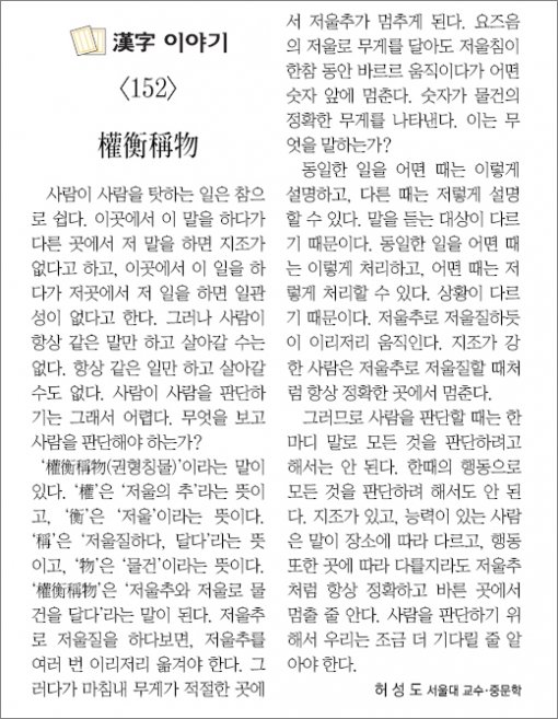 ‘權衡稱物(권형칭물)’이라는 말이 있다. ‘權’은 ‘저울의 추’라는 뜻이고, ‘衡’은 ‘저울’이라는 뜻이다. ‘稱’은 ‘저울질하다, 달다’라는 뜻이고, ‘物’은 ‘물건’이라는 뜻이다. ‘權衡稱物’은 ‘저울추와 저울로 물건을 달다’라는 말이 된다. 저울추로 저울질을 하다보면, 저울추를 여러 번 이리저리 옮겨야 한다. 그러다가 마침내 무게가 적절한 곳에서 저울추가 멈추게 된다. 요즈음의 저울로 무게를 달아도 저울침이 한참 동안 바르르 움직이다가 어떤 숫자 앞에 멈춘다. 숫자가 물건의 정확한 무게를 나타낸다. 이는 무엇을 말하는가?