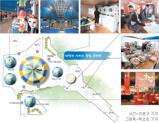 공연장인 빅톱 안은 겉옷을 벗고 있어도 될 만큼 훈훈하다. 컨테이너 크기의 발전기 5대가 이 마을에 전력을 공급한다. 2544석 규모의 빅톱은 지름이 50.5m, 높이는 23.9m 규모. 맨 앞줄 44석(R석)은 ‘태양의 서커스’ 측 요청에 따라 장애인에게 우선 배정되며 장애인 전용 화장실과 별도 출입구도 마련됐다.
