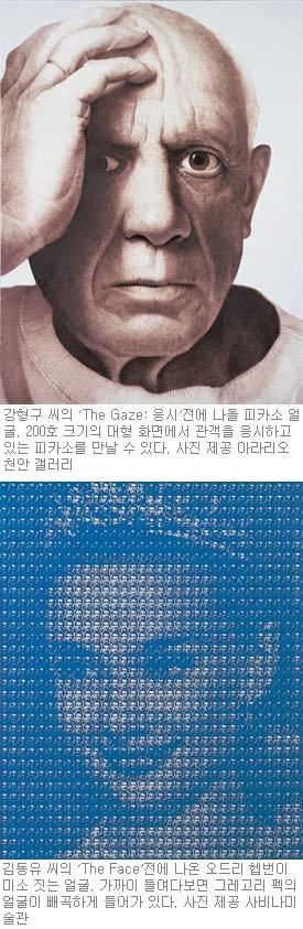 얼굴은 ‘드러냄’과 ‘감춤’을 동시에 지니고 있다. 얼굴은 인생의 이력서이지만 비밀의 수장고이기도 하다. 특히 대중에게 낯익은 얼굴일수록 대중이 모르는 얼굴을 여럿 가지고 있다. 강형구(53) 김동유(42) 씨는 얼굴을 파고드는 한국의 대표적인 작가들로 비슷한 시기에 전시를 연다. 강 씨는 5일∼8월 19일 아라리오 천안 갤러리(041-551-5100)에서, 김 씨는 30일까지 서울 사비나미술관(02-736-4371)에서 얼굴 작품을 내놓는다. 두 사람의 작품은 기법이나 이미지가 대조적이다. 강 씨는 극사실 기법으로 눈을 또렷하게 그린 대형 얼굴을, 김 씨는 작은 얼굴 1000여 개로 전혀 다른 인물을 만들어 낸다.
