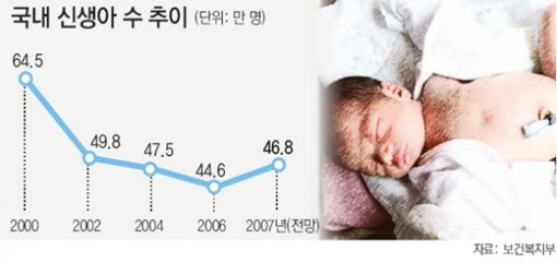‘즈믄둥이(밀레니엄 베이비)’ 출산 붐의 영향 때문에 상반기 기준으로 2000년 33만3227명으로 증가했던 신생아 수는 2002년 26만3273명, 2004년 24만6845명, 2005년 22만2838명으로 계속 줄어들다가 지난해에는 22만7295명으로 4457명이 늘었다.