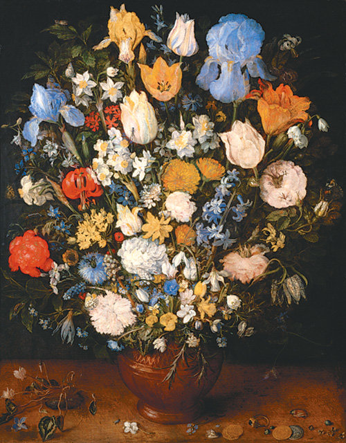 화면 속 꽃다발을 보면 좀 이상하지 않은가. 이 꽃들은 사실인가 허구인가. 화면 위쪽의 꽃들은 화병에 꽂혀 있는 것이 아니라 붕 떠 있는 느낌이다. 이 꽃들은 한 계절에 필 수 없는 것들이다. 그러니 이 작품은 비사실적이다. 일종의 허구다. 아름다운 꽃에는 역설의 의미가 담겨 있다. 바닥에 떨어져 나뒹굴고 있는 꽃들을 보라. 화려한 꽃도 너무 쉽게 시들고 만다는 의미가 들어 있다. 삶의 덧없음이다.