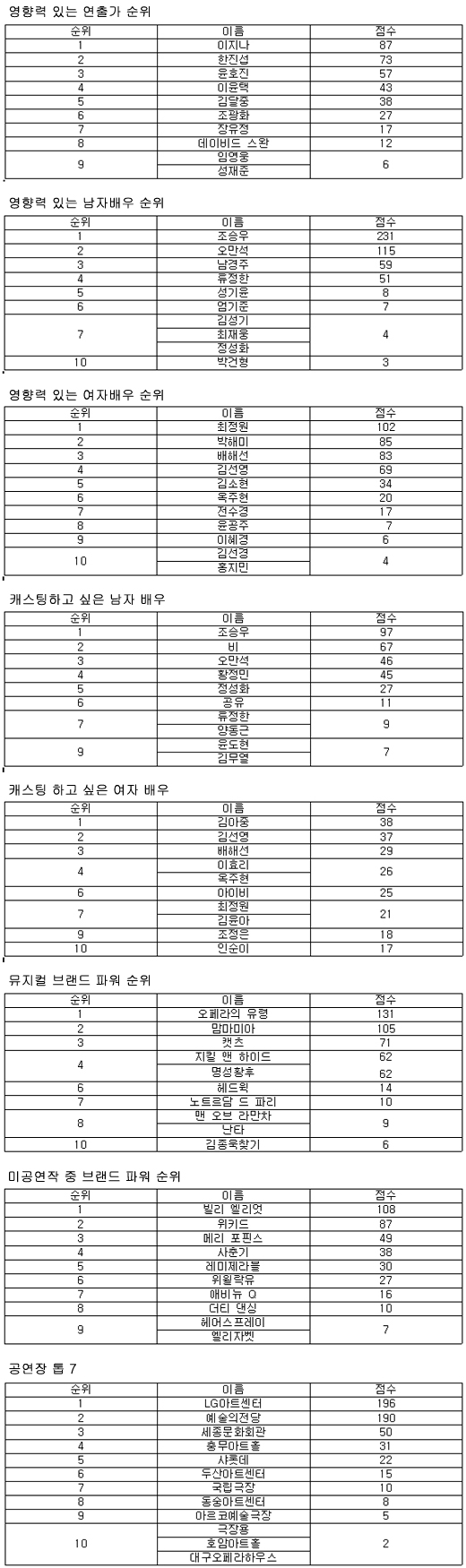 뮤지컬 배우와 가수, 연예인 등 모든 분야를 통틀어 가장 캐스팅하고 싶은 배우에서도 조승우는 부동의 1위였다. 그 뒤를 가수 비가 이었다. 뮤지컬 배우 출신으로 이젠 영화배우로 더 유명해진 황정민은 4위, 뮤지컬에 한 번도 출연한 적이 없는 공유는 6위를 차지했다. 영향력 있는 여배우에선 최정원이 여전히 1위로 건재했다. 모든 분야를 통틀어 캐스팅하고 싶은 여배우에서는 7위를 차지했다. 눈길을 끄는 것은 옥주현으로 가장 영향력 있는 여배우 7위, 각 분야를 통틀어 캐스팅하고 싶은 여배우로는 4위에 올라 두 편의 뮤지컬 출연 이후 뮤지컬 배우로 자리를 잡아 가고 있음을 알 수 있었다. 영화 ‘미녀는 괴로워’에서 가수 역할을 맡아 노래 솜씨를 뽐냈던 김아중은 여성 연예인을 포함해 가장 캐스팅하고 싶은 배우에 올랐다.