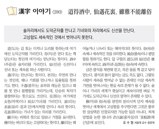 雖(수)는 비록의 뜻으로 양보나 가정을 표시한다. 雅(아)는 바르다 또는 고상하다는 뜻이다. 離(리)는 떼어놓거나 나누다 또는 헤어지다의 뜻이다. 俗(속)은 속세나 세속적인 것을 의미한다. 風俗(풍속)이나 평범함을 뜻하기도 한다. 앞 구절의 道(도)와 仙(선)은 雅(아)에 속하고, 酒(주)과 花(화)는 俗(속)에 속한다.