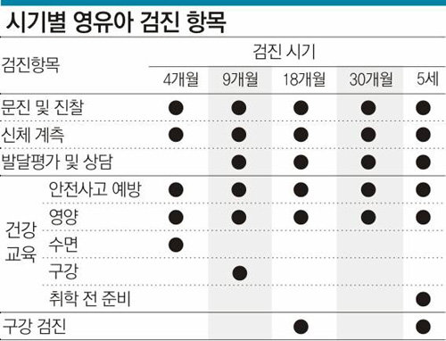 모든 영유아는 만 6세가 될 때까지 생후 4개월, 9개월, 18개월, 30개월, 5세 등 5회에 걸쳐 무료 검진을 받게 된다.