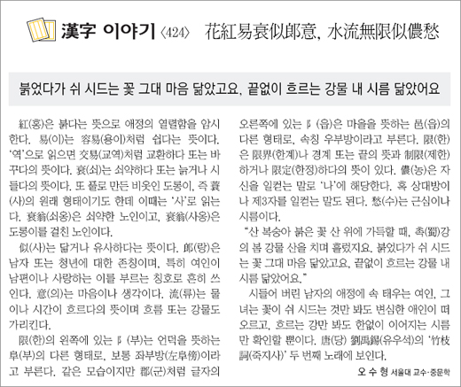 시들어 버린 남자의 애정에 속 태우는 여인, 그녀는 꽃이 쉬 시드는 것만 봐도 변심한 애인이 떠오르고, 흐르는 강만 봐도 한없이 이어지는 시름만 확인할 뿐이다. 唐(당) 劉禹錫(유우석)의 ‘竹枝詞(죽지사)’ 두 번째 노래에 보인다.