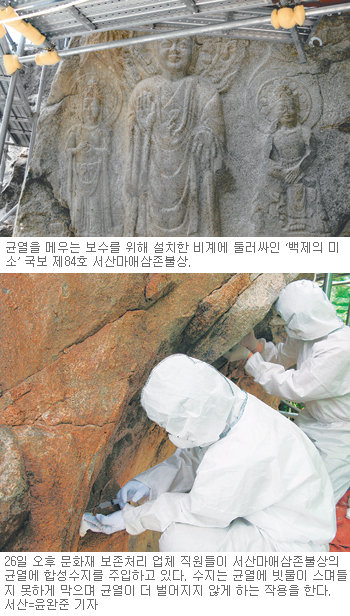 26일 오후 충남 서산시 국보 제84호 서산마애삼존불상(6세기 말∼7세기 초). 두 명의 사내가 ‘백제의 미소’로 불리는 이 마애불을 둘러싼 좁은 비계에 쭈그리고 앉아 무언가에 열중하고 있다. 한 치의 실수도 용납 못한다는 듯 침묵과 긴장 속에 이마에 땀만 송골송골 맺힌다.