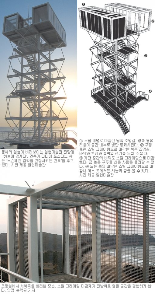 안양예술공원 입구에 3개의 육면체 공간을 철 계단으로 이어 올린 ‘1평 타워’와 일현미술관 전망대는 많이 닮았다. 모두 기계적 이미지의 구조 미학, 용도가 미리 제한되지 않은 단순한 공간을 추구했다. 그러나 무대가 공원에서 해변으로 옮겨지면서 꼭대기의 전망은 비교할 수 없이 확장됐다.