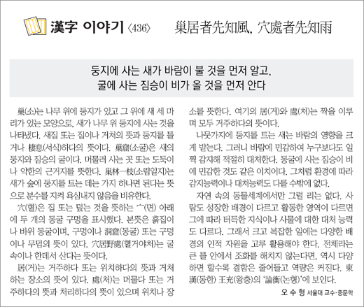 나뭇가지에 둥지를 트는 새는 바람의 영향을 크게 받는다. 그러니 바람에 민감하여 누구보다도 일찍 감지해 적절히 대처한다. 동굴에 사는 짐승이 비에 민감한 것도 같은 이치이다. 그처럼 환경에 따라 감지능력이나 대처능력도 다를 수밖에 없다.
